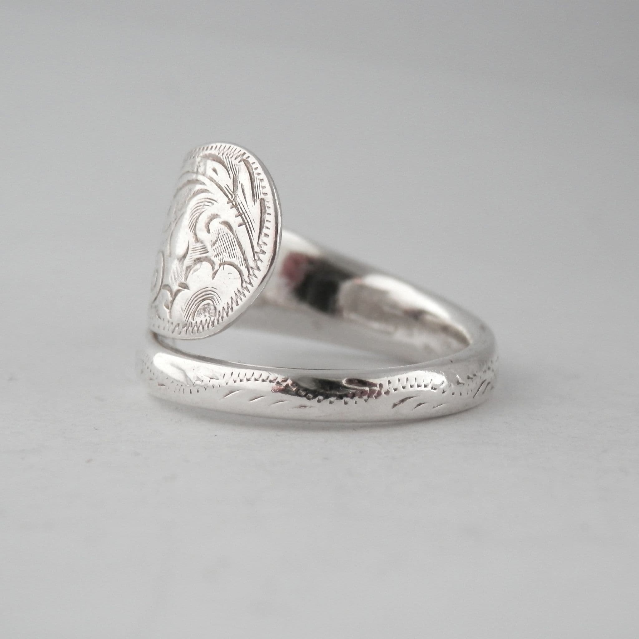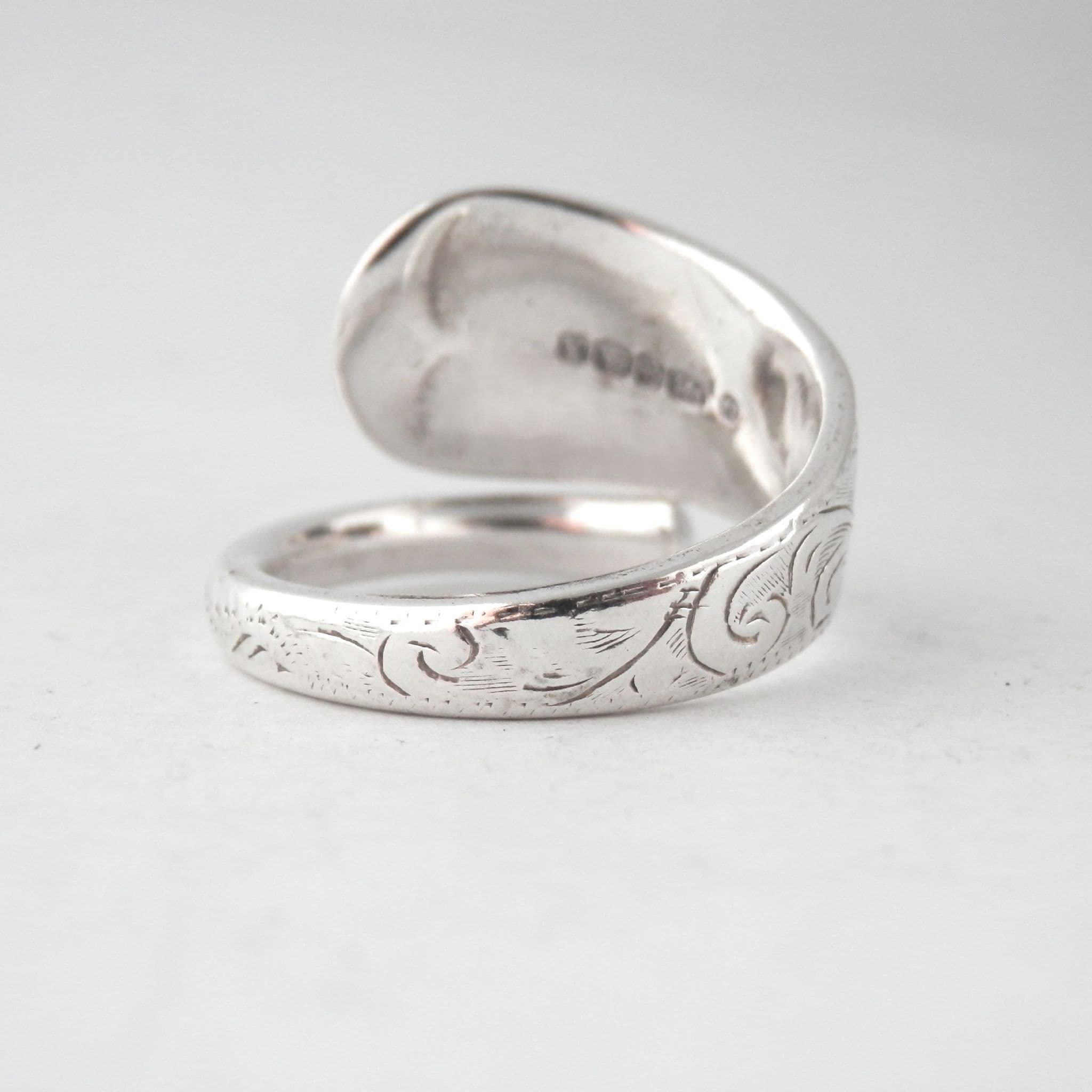 This lovely ring has been hand crafted from a beautifully detailed designed sterling silver 925 spoon handle. The simple handle has been stunningly crafted with high quality. The ring carries a full set of English hallmarks to the inside including makers mark for CA, Lion Passant, 925, assayed in Birmingham in 2025. It has a stunning ornate bright cut swirl design.
