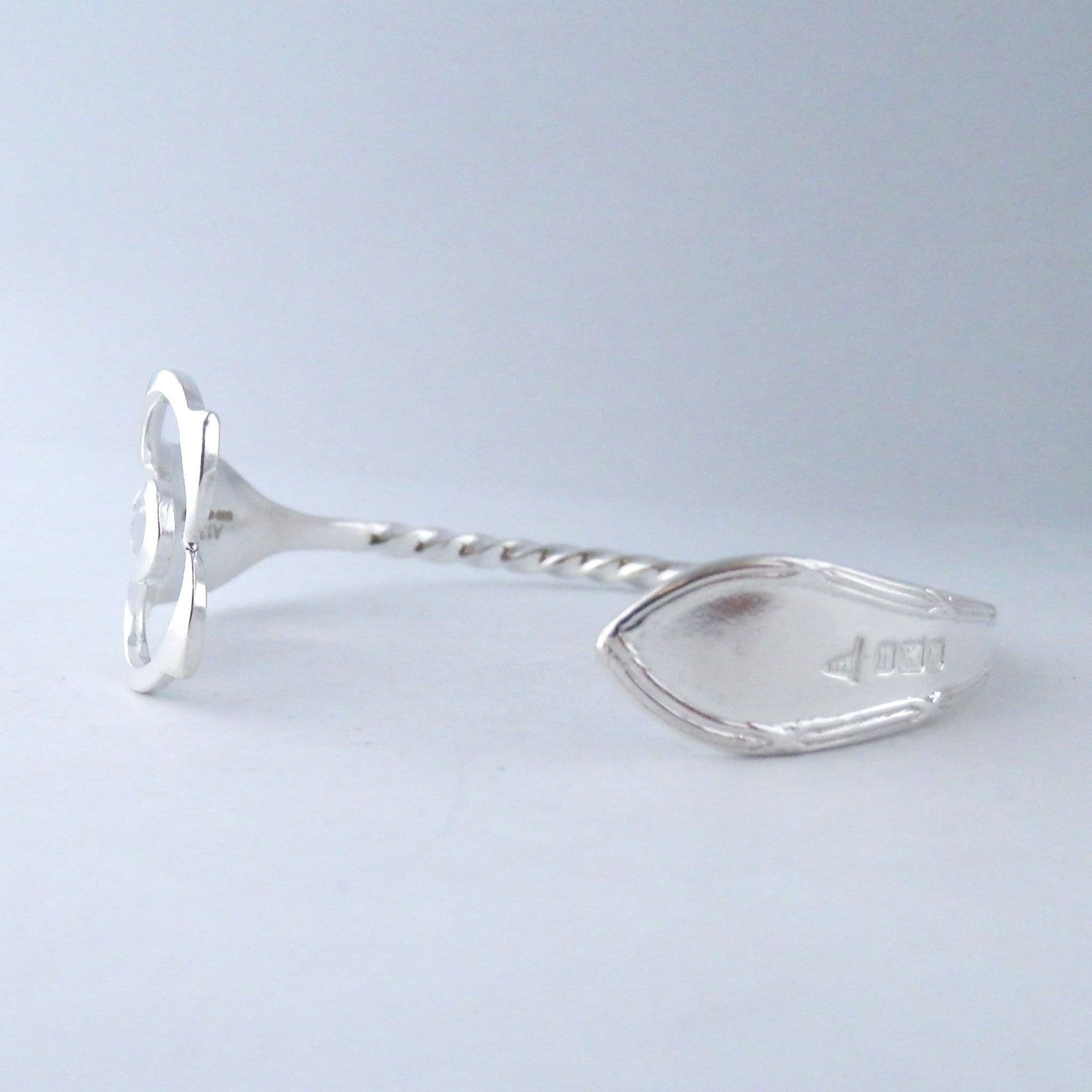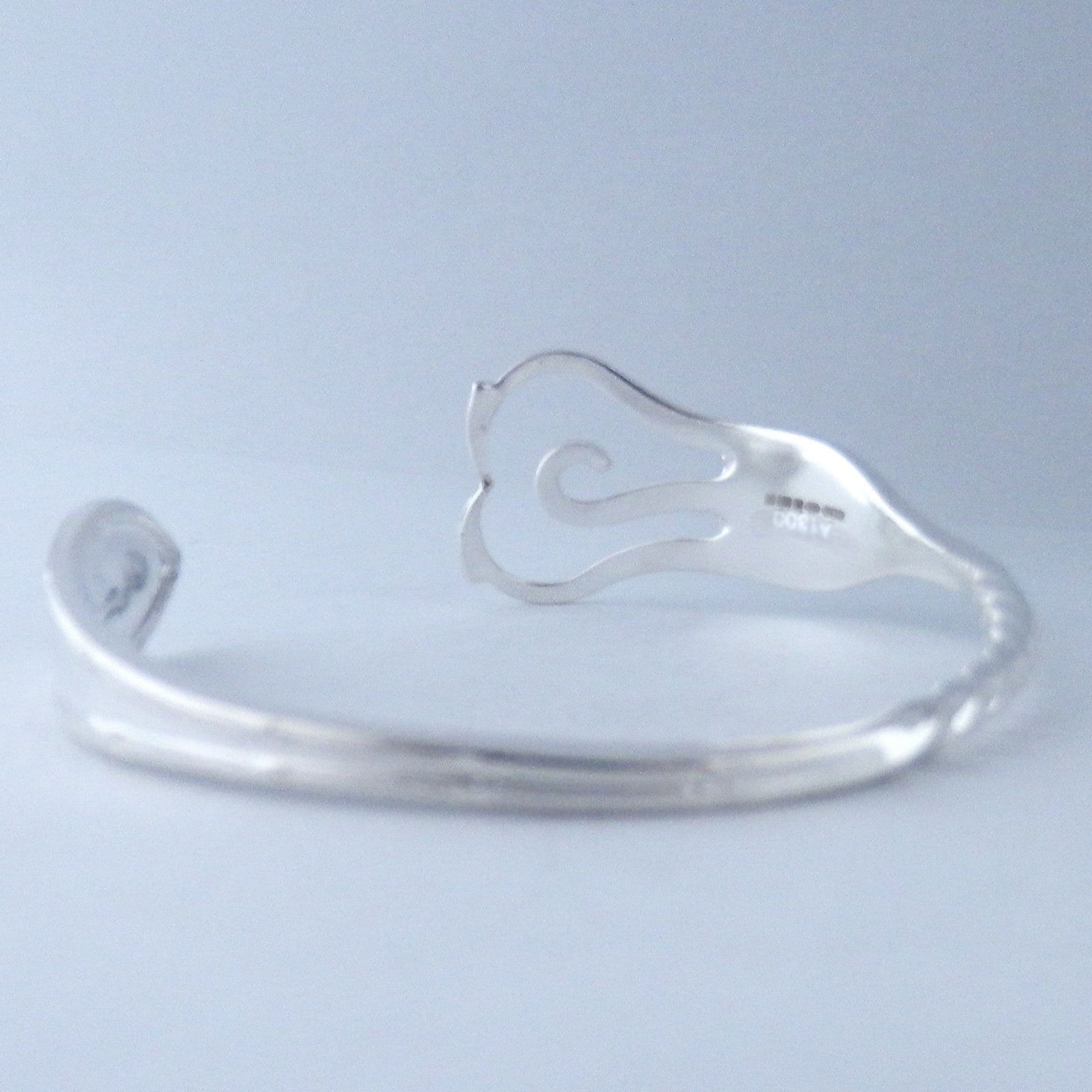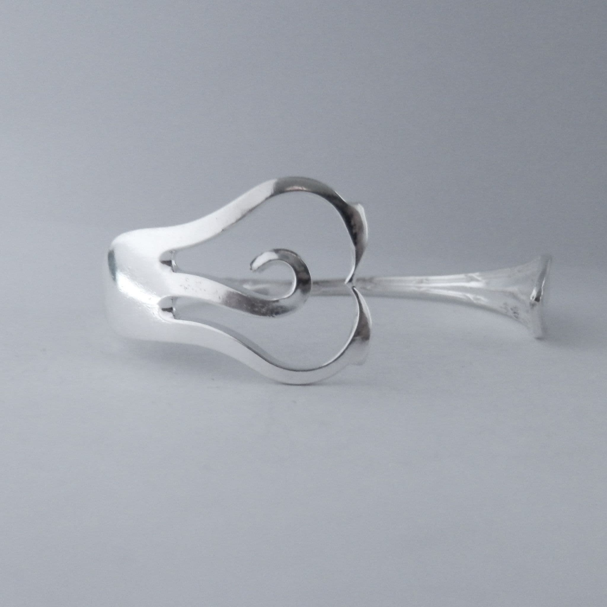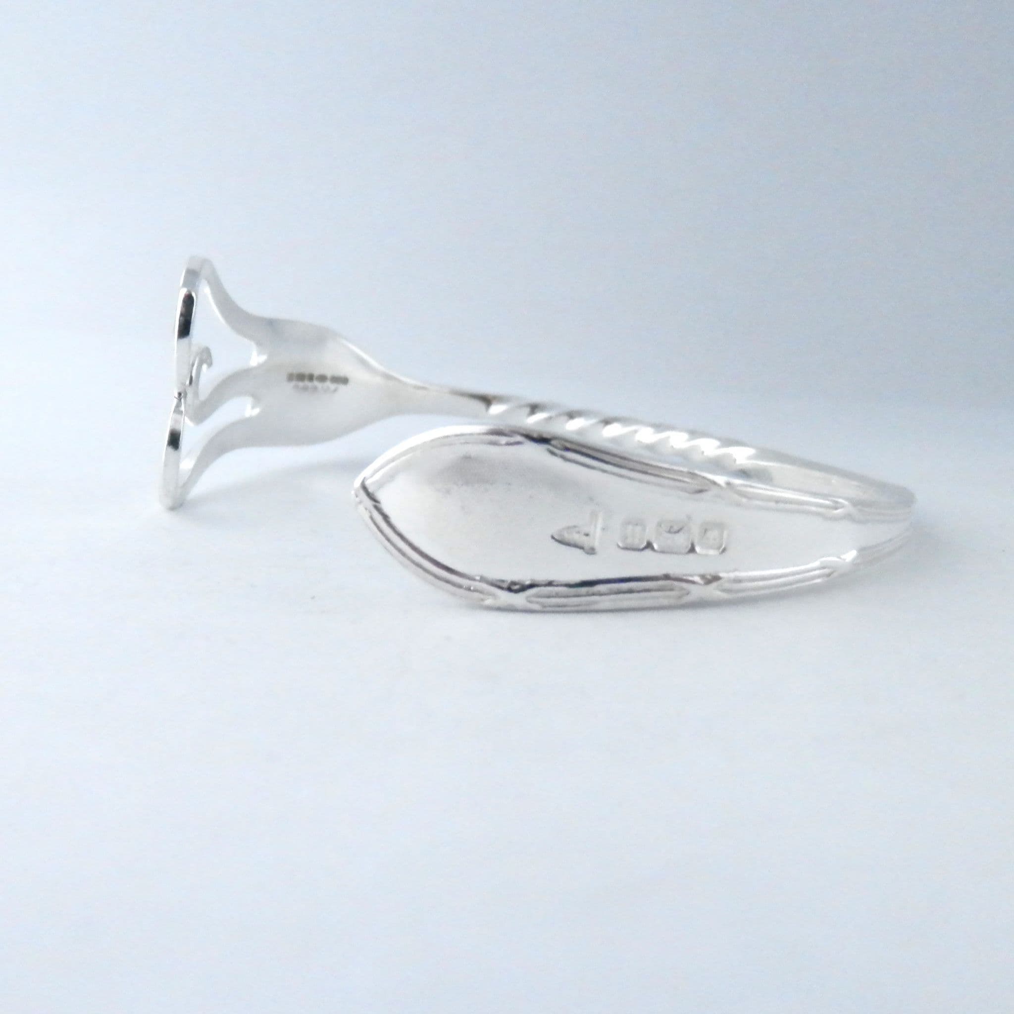 This lovely one of a kind bangle offers the opportunity to expand the historical story of spoon rings to co-ordinating jewellery. It has been hand crafted from a beautifully simple antique sterling silver fork which carries a full set of Sheffield hallmarks dated 1912, also including makers mark for Walker and Hall and the Lion Passant for sterling silver. The prongs of the fork have been reshaped to form a wonderful classic heart with a focal swirl design. The oval bracelet is a larger size at 6.8cm diameter and weighs 30 grams.